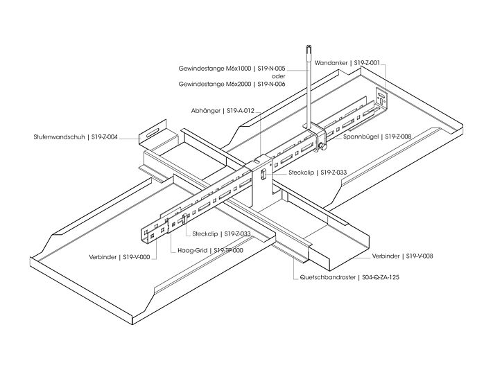 Das lineare Quetschbandrastersystem HAAG 4 hat eine sichtbare, parallel laufende Unterkonstruktion. Diese ermöglicht auch eine variable Raumaufteilung, indem verschiebbare Trennwände bei Bedarf an den Bandrasterprofilen befestigt werden.